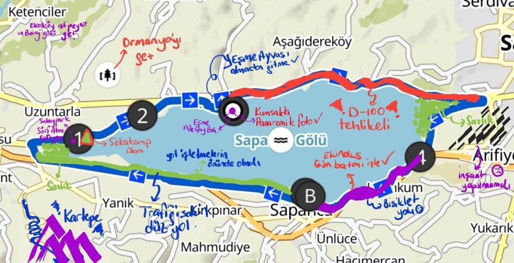- Sapanca’dan batı istikametinde bu yolu takip ederken 100m kıyı kanununa rağmen göl ile aranızda hep restorantlar, kır düğünü mekanları, kahvaltıcılar, özel piknik alanları ile fidancılıkla uğraşan işletmeler mevcut Göl ile ilk temas Sekamp’ında gerçekleşiyor.